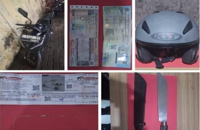 “Tak hanya itu, kata Suroto juga ada sepeda motor Honda Vario 150 Nopol L-5342-EY yang digunakan sarana, Sebuah pisau ukuran 45 Cm lengkap Sayung terbuat dari kulit, STNK asli Honda Vario dan Helm KYT warna abu abu.” Tambah Suroto.