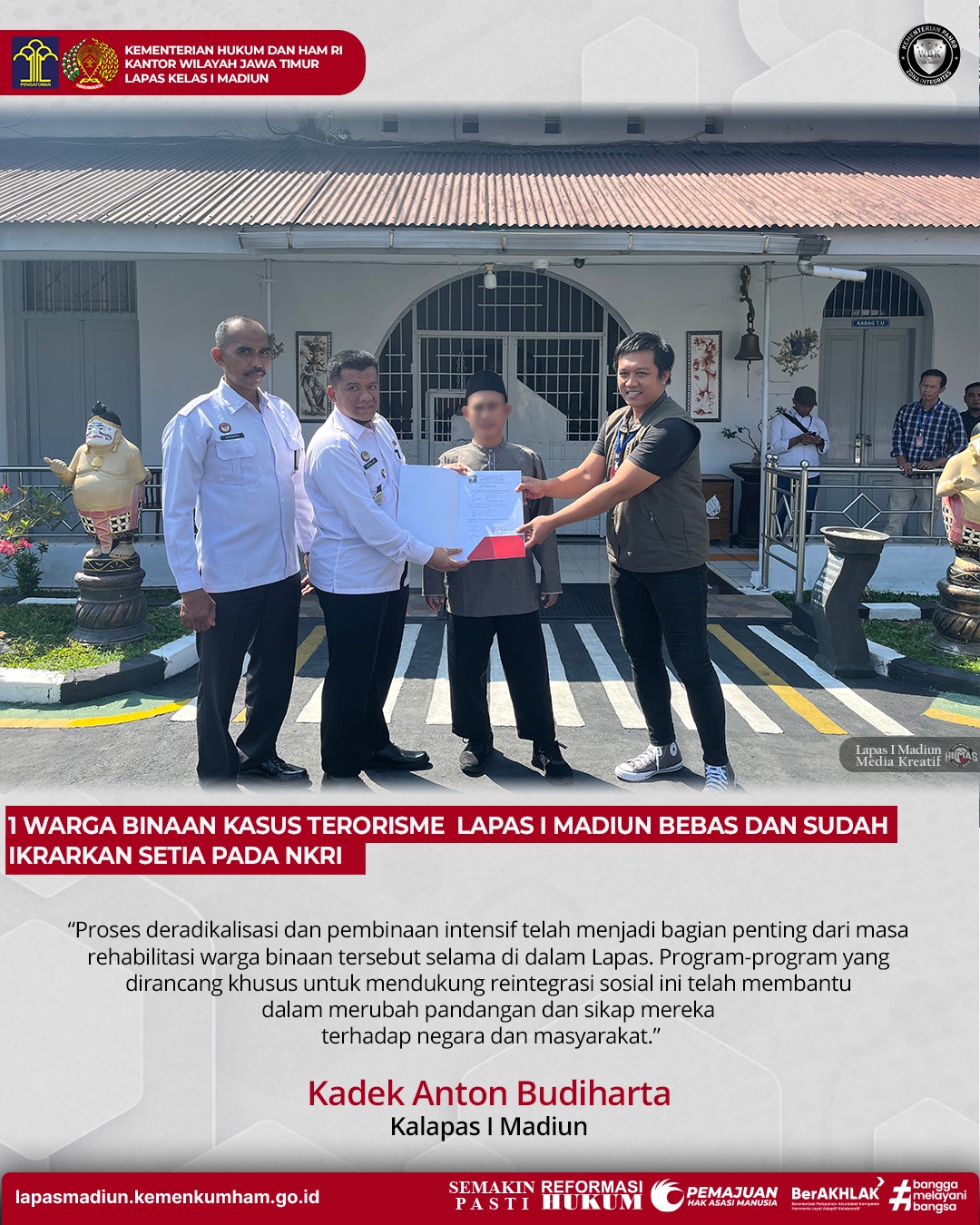 Kalapas I Madiun Kadek Anton Budiharta menyatakan “Proses deradikalisasi dan pembinaan intensif telah menjadi bagian penting dari masa rehabilitasi warga binaan tersebut selama di dalam Lapas. Program-program yang dirancang khusus untuk mendukung reintegrasi sosial ini telah membantu dalam merubah pandangan dan sikap mereka terhadap negara dan masyarakat.