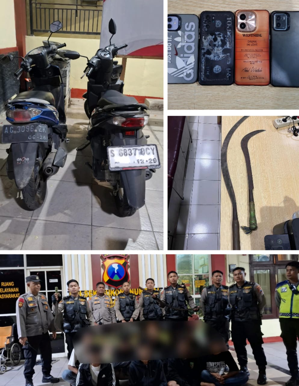 Dari tangan para pemuda tersebut, polisi turut mengamankan barang bukti berupa, dua unit sepeda motor (Beat Hitam plat S 6837 QCY dan Yamaha Mio Biru plat AG 3096 ZX), empat unit handphone dan dua buah senjata tajam, yakni satu celurit panjang dan satu corbek.