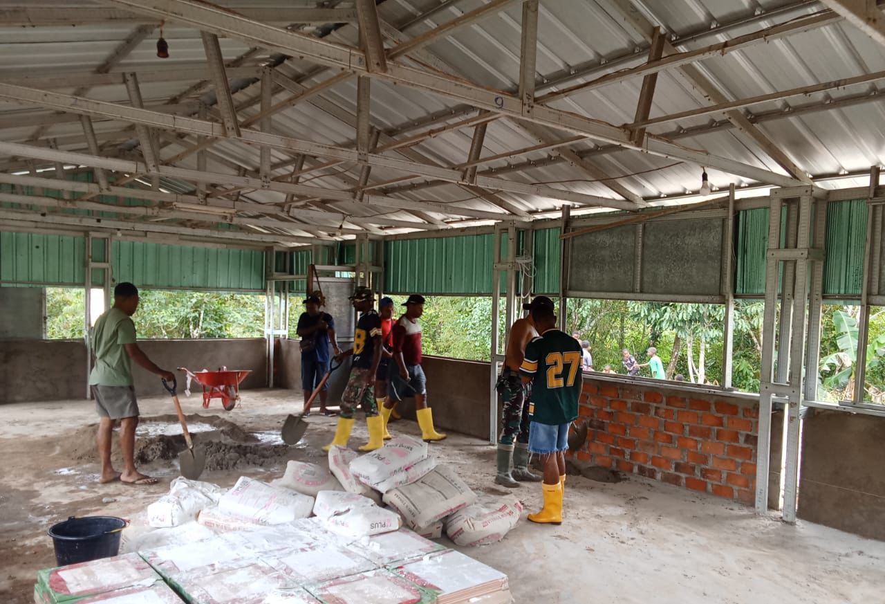 Personel Satgas TMMD bersama warga bergotong royong melanjutkan pekerjaan pemasangan dinding, plesteran, dan penataan bagian dalam gereja. Kegiatan tersebut dilakukan dengan semangat tinggi meskipun kondisi lapangan cukup menantang. Kekompakan antara TNI dan masyarakat menjadi kunci utama dalam mempercepat penyelesaian pembangunan.