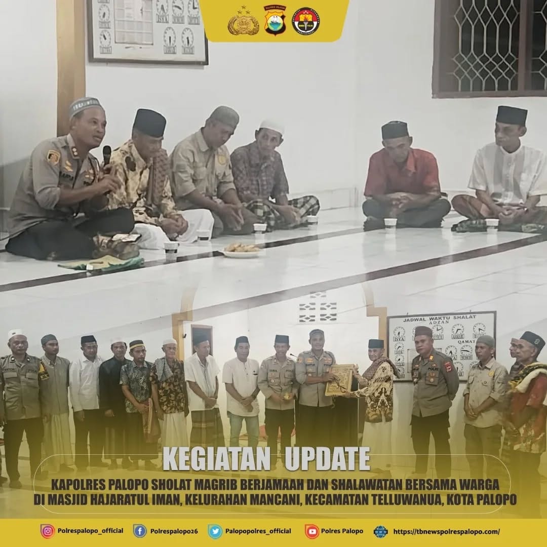 Palopo – Kapolres Palopo, AKBP Safi’i Nafsikin sholat magrib berjamaah dan shalawatan bersama warga di Masjid Hajaratul Iman, Lingkungan Batu Rante, Kelurahan Mancani, Kecamatan Telluwanua, Kota Palopo, Senin (6/1/2025).