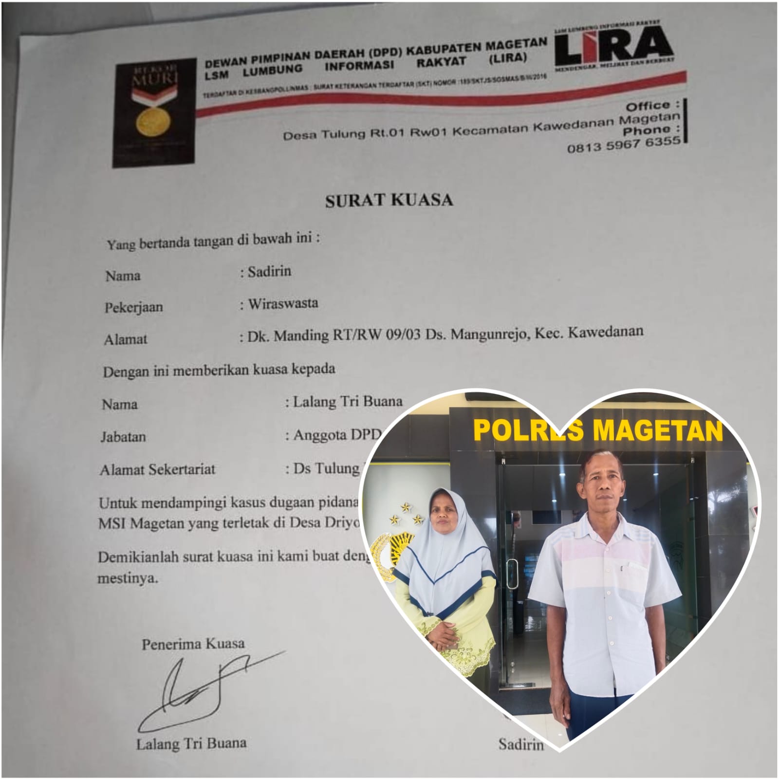 Tanggal 2 Maret Sadirin dapat undangan ke Polres Magetan jam 10, dengan di temani Bolang anggota LSM LIRA Magetan menghadap IPTU Dedy Norrawan R.SH.