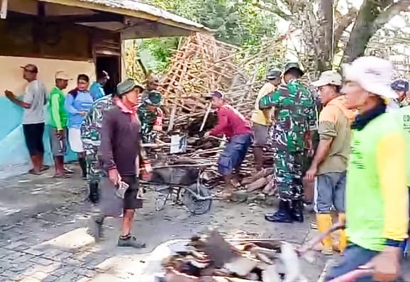 Babinsa Koramil Kepohbaru Bojonegoro dan Warga Gotong Royong bersihkan Reruntuhan Gedung SDN Pejok