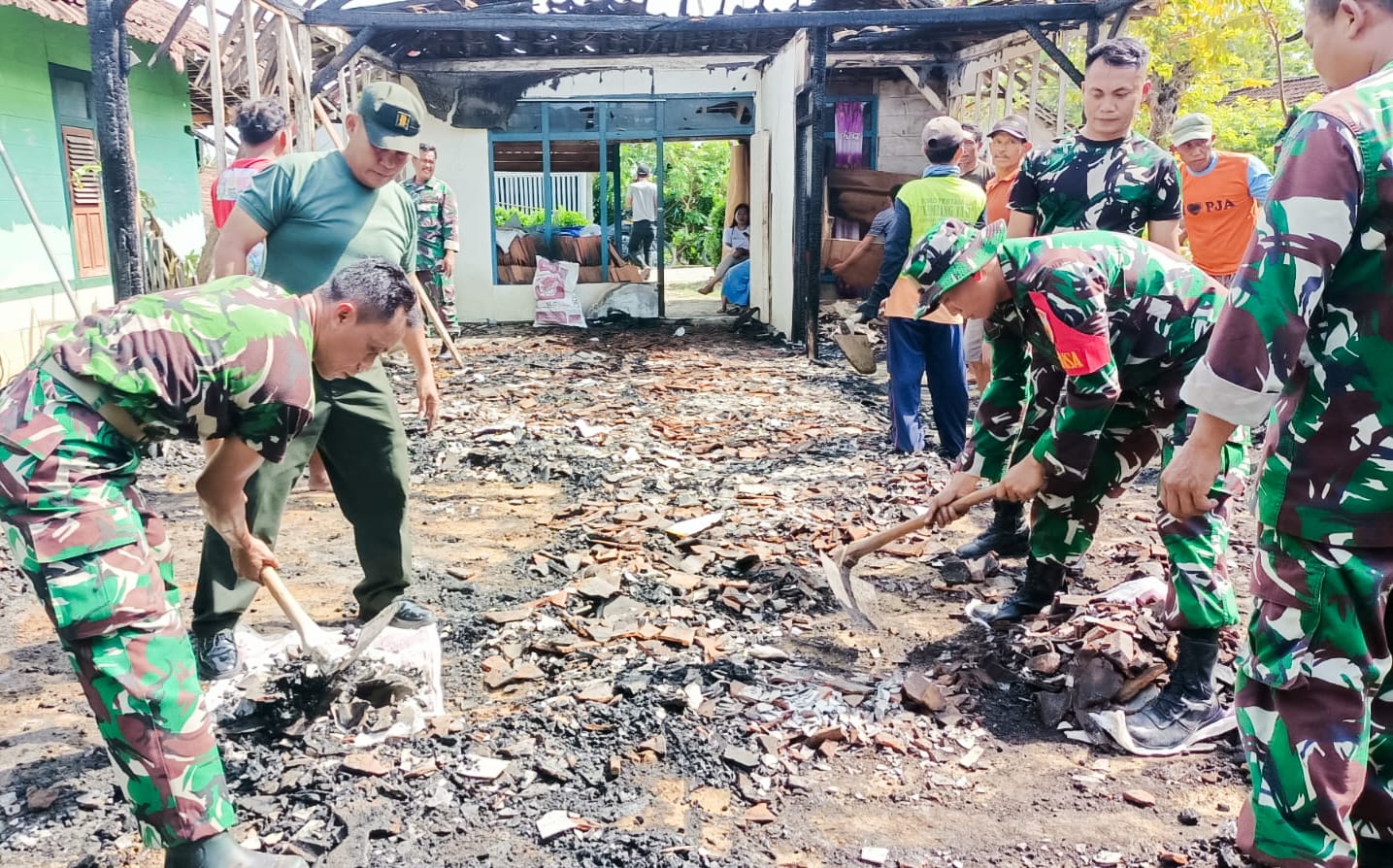 Puing-puing sisa rumah terbakar itu tampak berserakan, dan dibersihkan oleh anggota Babinsa Koramil 0813-24/Temayang bersama perangkat Desa Kedungsari dan warga masyarakat sekitar.
