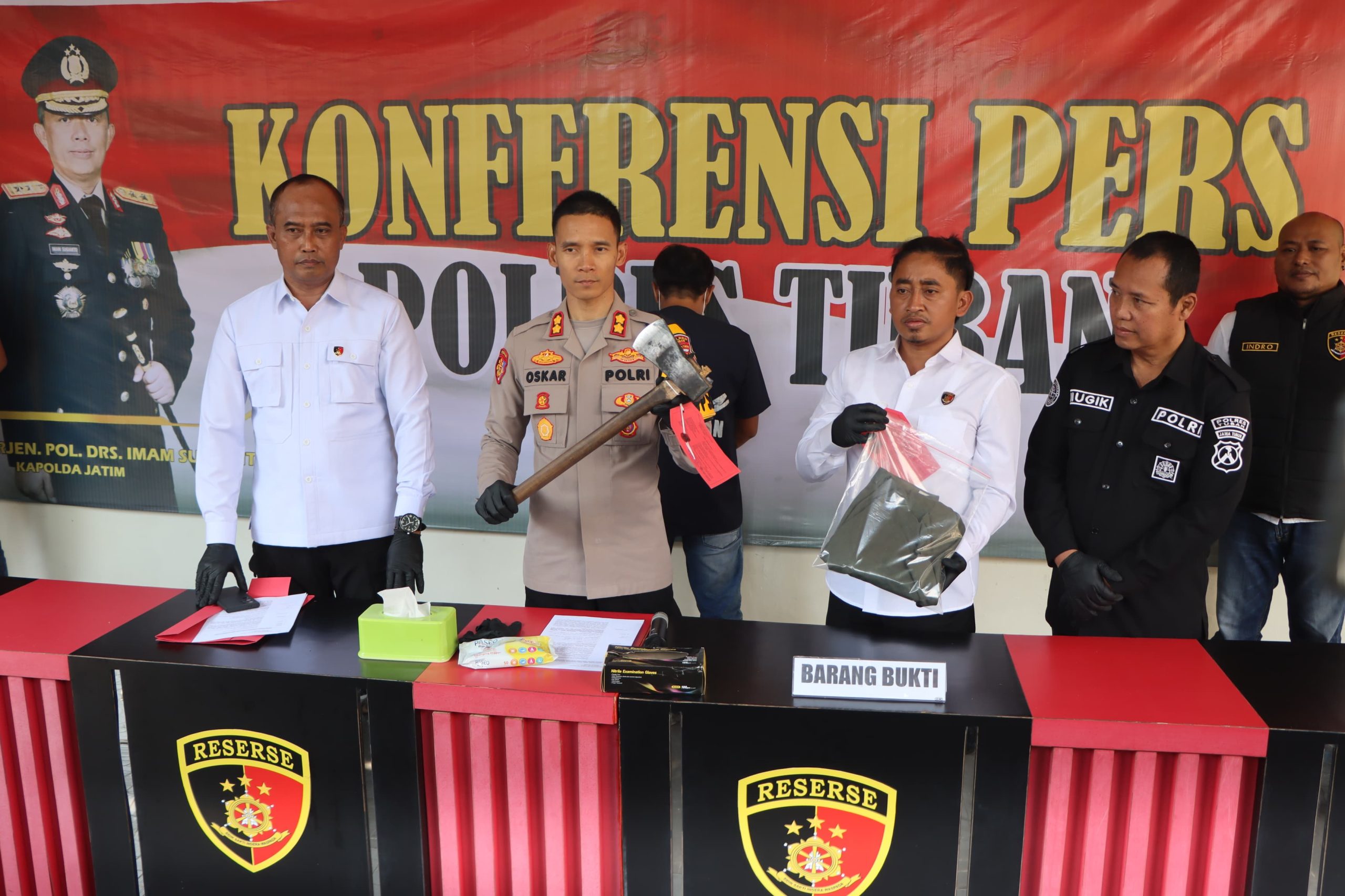 Saat pimpin konferensi pers pada Senin (29/07/2024) Kapolres Tuban AKBP Oskar Syamsuddin, S.I.K., M.T., menerangkan korban diserang pelaku dengan menggunakan kapak karena merasa tidak terima saat ditegur karena kedapatan membawa kayu jati hasil curian.
