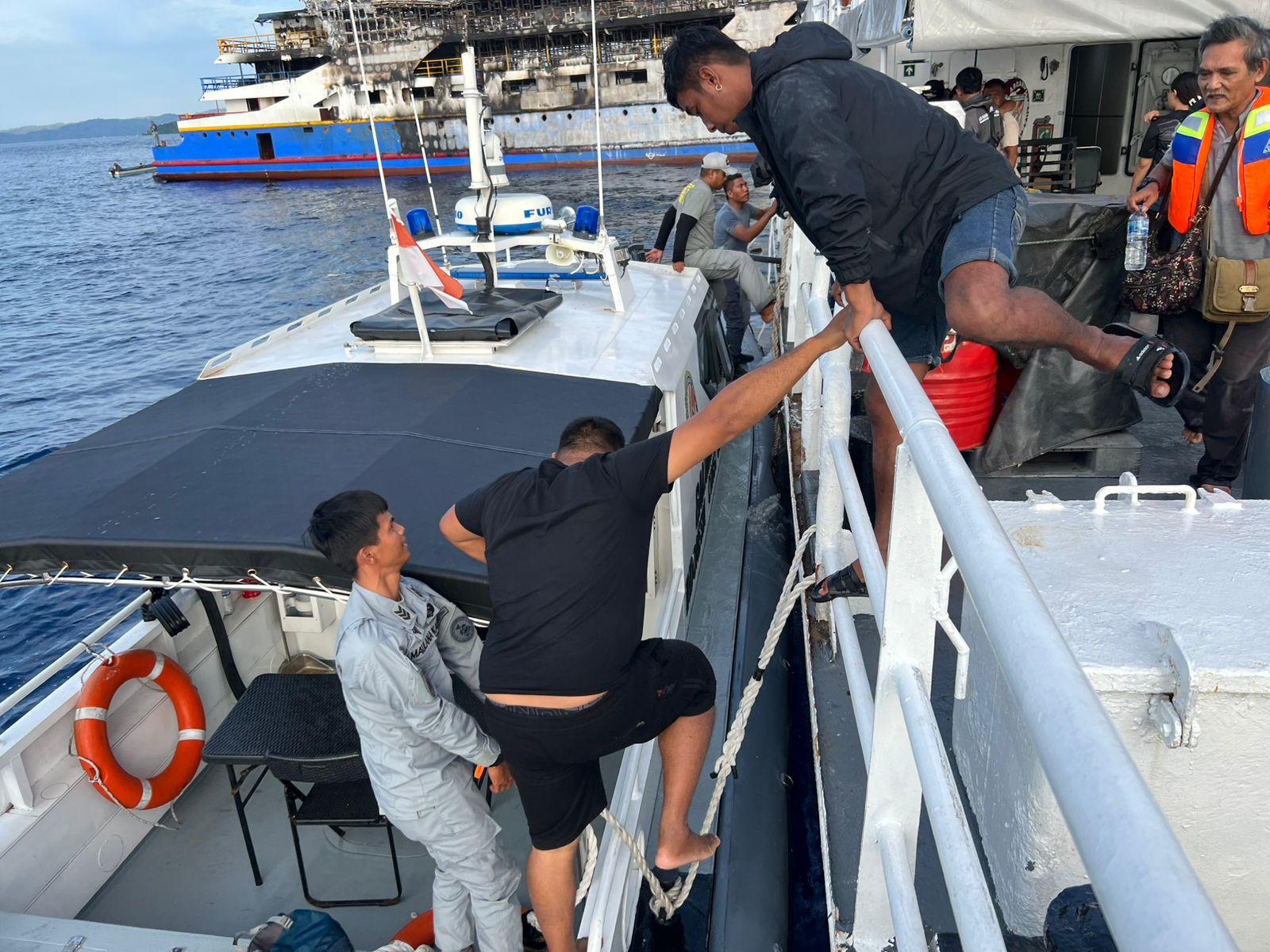 Beberapa penumpang langsung terjun ke laut menggunakan life jacket, sementara nelayan setempat turut membantu mengevakuasi korban ke Pulau Talise dan Pulau Gangga.