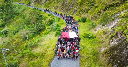 Puncak Jaya – Satgas Pamtas Kewilayahan Yonif 715/Motuliato mengajak jajaran Aparat Keamanan (Apkam) yang ada di Puncak Jaya, bersama dengan seluruh elemen masyarakat di Puncak Jaya, Papua Tengah, mengibarkan bendera Merah Putih raksasa di bukit zaitun pada Kamis (01/05/2025).