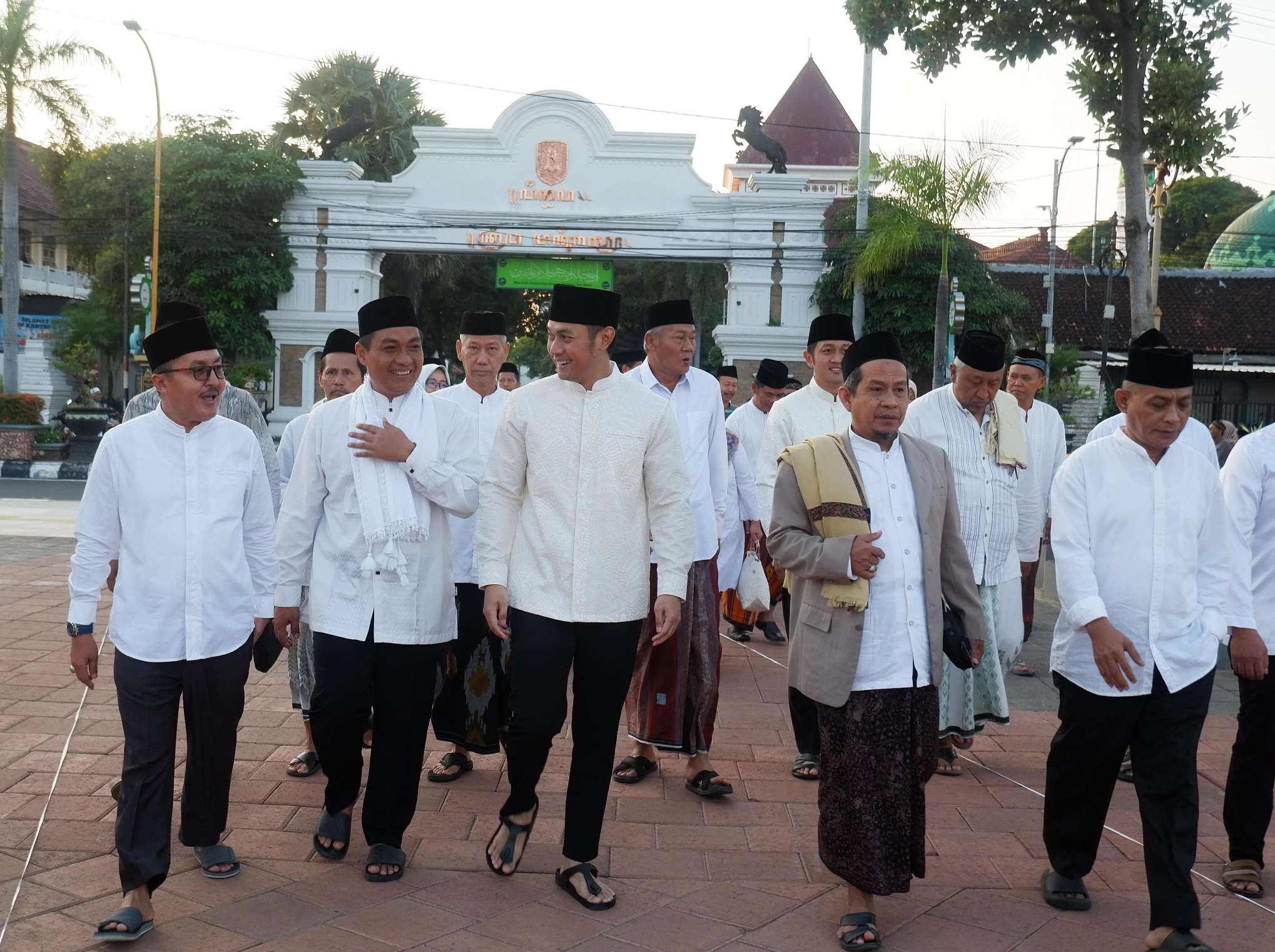Dengan mengenakan baju putih dipadu dengan peci hitam, rombongan Forkopimda Tuban berjalan kaki dari Pendapa Kridha Manunggal menuju Masjid Agung Tuban.