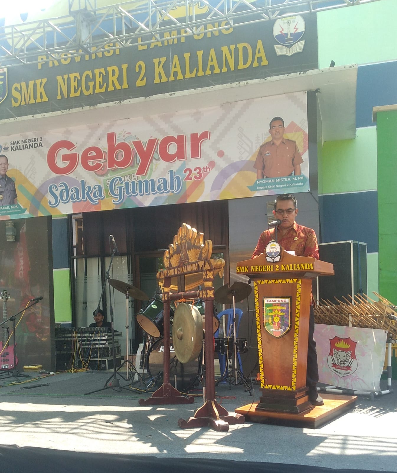 Dalam sambutannya Kepala Sekolah (Kepsek-SMKN2 Kalianda Lamsel) Nyoman Mister, M.Pd mengatakan bahwa, “kegiatan ini dilaksanakan setiap tahun semenjak SMKN2 berdiri tahun 2000 sampai sekarang sudah enam kali pergantian Kepala Sekolah, dan Dalam Gebyar Sdaka Gumah th 2023 ini mengadakan kegiatan Job Fair terdiri dari 12 stand dan stand kerajinan di Sekolah Menengah Kejuruan Negeri II (SMKN2) Kecamatan Kalianda, Kabupaten Lampung Selatan ini,” ungkapnya.