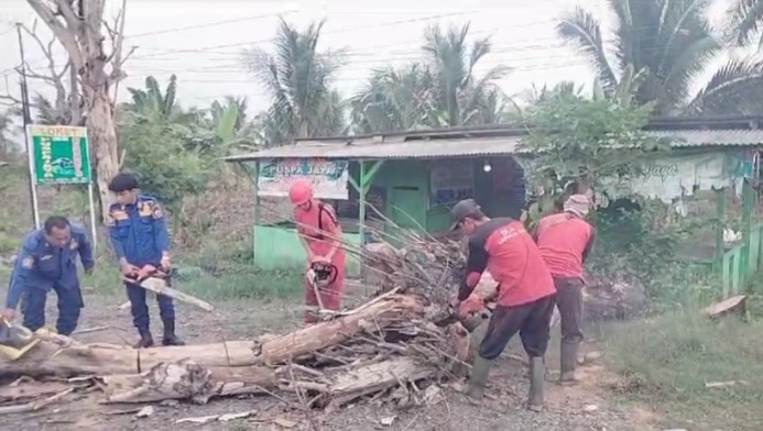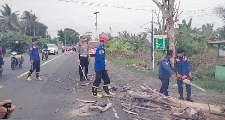 Transpos.id. Kalianda Lampung Selatan – Gabungan dari Dinas Pemadam Kebakaran dan Penyelamatan (Damkarat) Kabupaten Lampung Selatan serta Polres Lampung Selatan, Dinas Lingkungan Hidup (DLH), Dinas Perhubungan (Dishub) Lampung Selatan secara Bergotongroyong Tebang Pohon Yang Sudah Mati Dipinggir Jalan Lintas Sumatera (Jalinsum) Kalianda Lampung Selatan.