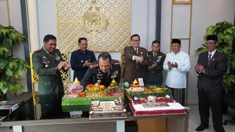 Dandim 0510/Tigaraksa Letkol Arh Syarief SB bersama PJ Bupati, Kajari, Danden Rudal 003 dan ketua MUI Kabupaten mendatangi markas Polresta Tangerang, bersama rombongan dengan membawa kue tart dan tumpeng bertuliskan HUT Bhayangkara ke 78. Senin lalu (1/7/2024).