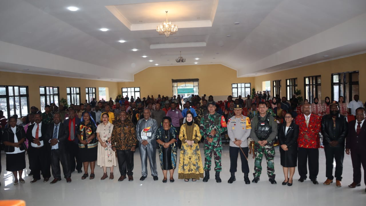 Acara ini dihadiri oleh sejumlah pejabat penting, termasuk Pj. Bupati Puncak Jaya Yopi Murib, S.E., M.M., Kapolres Puncak Jaya AKBP Kuswara, S.H., S.I.K., M.H., Dandim 1714/PJ Letkol Inf. Irawan Setya Kusuma, serta para tokoh agama, tokoh masyarakat, dan pemuda.
