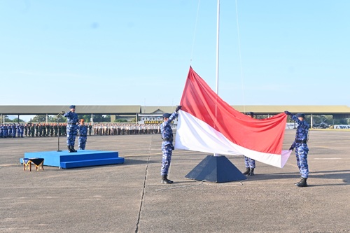 Makassar – Komandan Lanud Sultan Hasanuddin, Marsma TNI Arifaini Nur Dwiyanto M. Han., memimpin upacara bendera 17-an, yang diikuti seluruh personel mulai dari para Kepala Dinas, Danwing II Kopasgat, Komandan Satuan, para Perwira, Bintara, Tamtama dan Pegawai Negri Sipil (PNS) Lanud Sultan Hasanuddin, bertempat di Apron Baseops, Lanud Sultan Hasanuddin, Makassar, Senin (19/5/2025).
