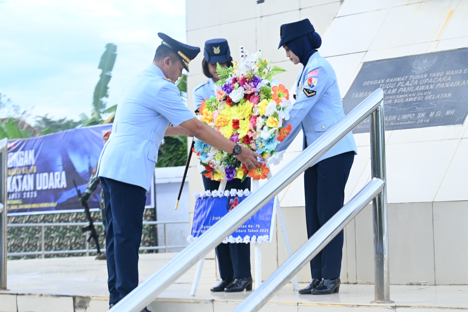 Makassar – Komandan Lanud Sultan Hasanuddin Marsma TNI Arifaini Nur Dwiyanto, M.Han., pimpin upacara ziarah dalam rangka Peringatan Ke-78 Hari Bakti TNI Angkatan Udara, di Taman Makam Pahlawan (TMP) Panaikang, Makassar, Senin (28/7/2025).
