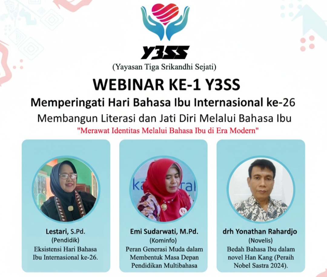 Bojonegoro – Peringatan Hari Bahasa Ibu Internasional ke-26 dimaknai secara reflektif oleh Yayasan Tiga Srikandhi Sejati (Y3SS) melalui penyelenggaraan Webinar ke-1 bertema “Membangun Literasi dan Jati Diri Melalui Bahasa Ibu” dengan subtema “Merawat Identitas Melalui Bahasa Ibu di Era Modern.” Kegiatan ini menjadi ruang dialog untuk menegaskan kembali peran bahasa sebagai fondasi identitas, literasi, dan masa depan peradaban bangsa.