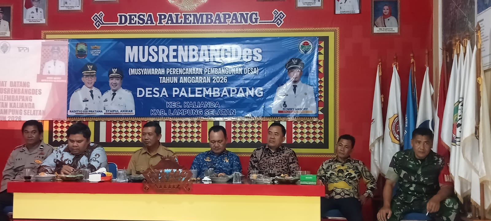 Musrenbangdes dibuka secara resmi oleh Camat Kalianda yang diwakili Sekretaris Kecamatan M.Nur SE, dan disambut langsung oleh Kepala Desa Palembapang Rommy Ansory. Dalam sambutannya, M.Nur S.E menyampaikan apresiasi dan dukungan penuh kepada Pemerintah Desa Palembapang yang telah melaksanakan Musrenbangdes secara partisipatif.