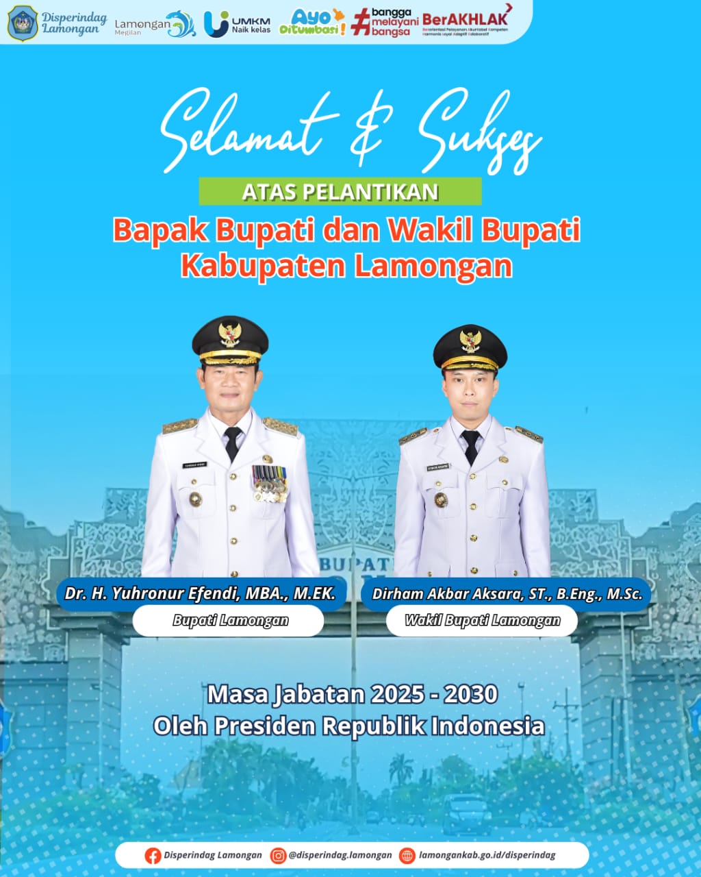 “Seluruh Jajaran Staf Disperindag Kabupaten Lamongan mengucapkan selamat kepada Bapak Dr. H. Yurohnur Efendi dan Dirham Akbar Aksara atas dilantiknya sebagai Bupati dan wakil Bupati Kabupaten Lamongan” Ucap Anang.