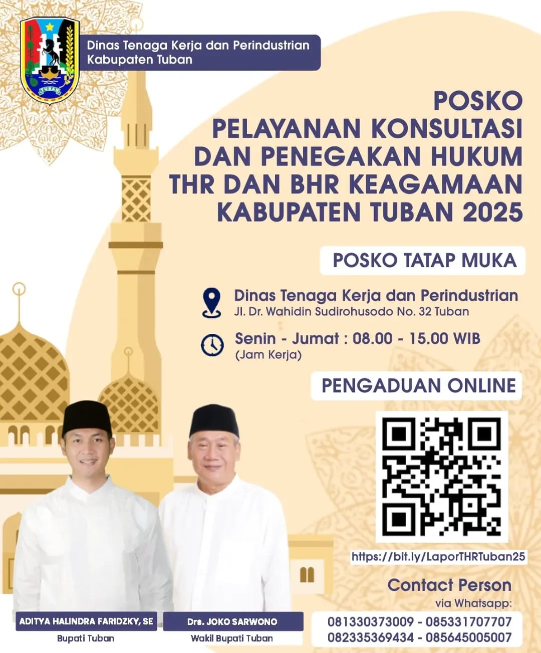 Sementara itu, bagi pekerja atau buruh yang ingin melaporkan permasalahan THR atau BHR secara daring, dapat mengakses tautan bit.ly/LaporTHRTuban25 atau menghubungi layanan WhatsApp di nomor 0813-3037-3009, 0853-3170-7707, 0823-3536-9434, dan 0856-4500-5007.
