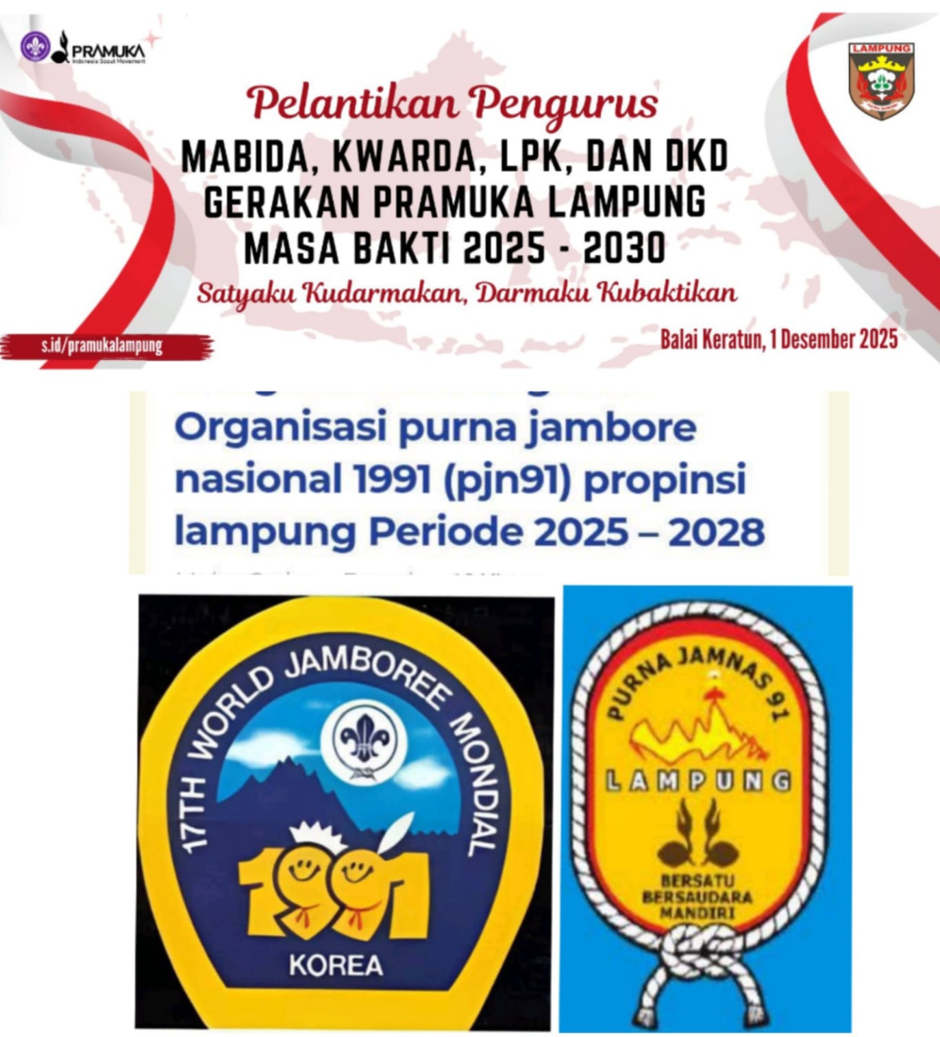Bandar Lampung,Transpos.id. – Dewan Pimpinan Daerah (DPD) Pj91(purna jambore) Lampung menyampaikan ucapan selamat kepada seluruh calon pengurus Gerakan Pramuka Kwartir Daerah (Kwarda) Provinsi Lampung yang akan resmi dilantik pada acara pelantikan yang dijadwalkan pada hari Senin,01 Desember 2025 di balai keratun gubernuran Lampung.