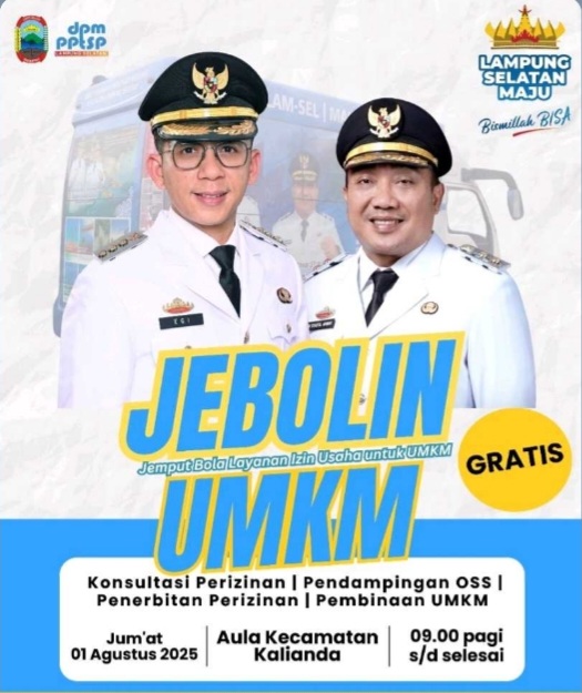 – Program “Jebolin UMKM” akan digelar secara keliling ke 17 kecamatan di wilayah Lampung Selatan, dimulai dari Kecamatan Kalianda pada 1 Agustus 2025.