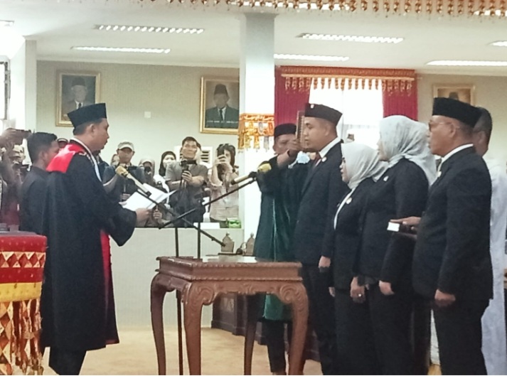 Pelantikan dan pengucapan sumpah pimpinan DPRD tesebut dipimpin langsung oleh Ketua Pengadilan Negeri Kalianda Kelas IB, Arizal Anwar, yang dipusatkan di ruang sidang utama kantor DPRD setempat, Senin (14/10/2024)