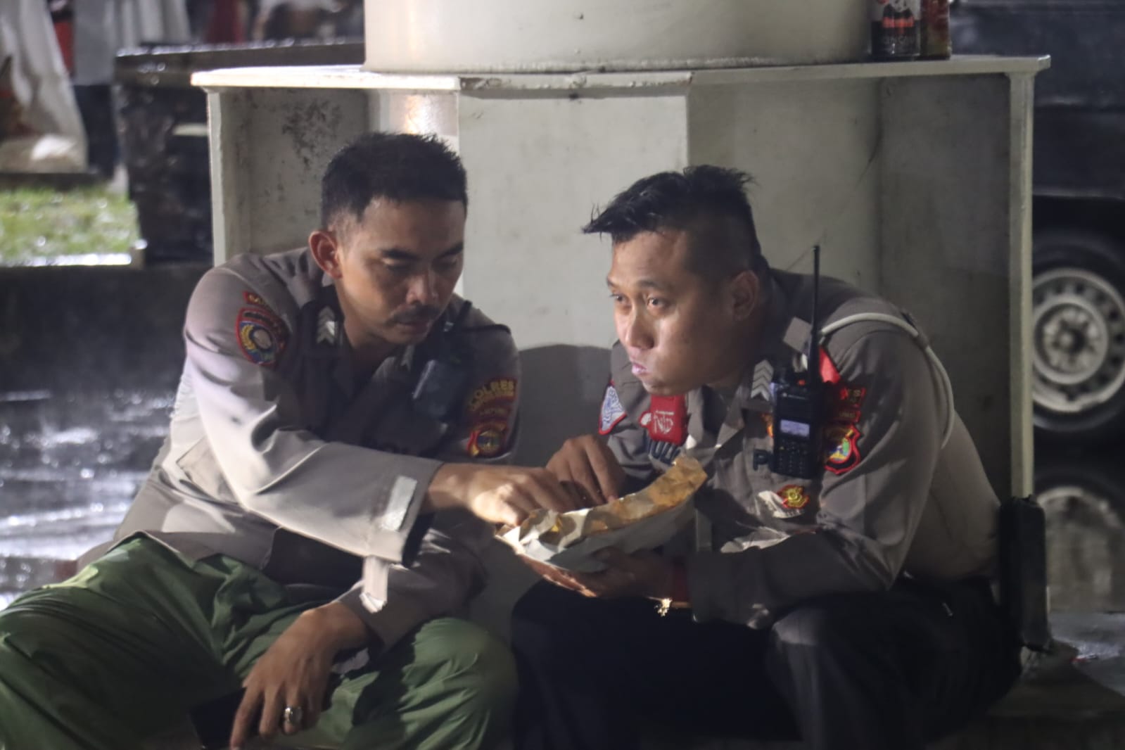 Dua Polisi Nikmati Nasi Bungkus Bersama di Dermaga Bakauheni Saat Hujan Deras