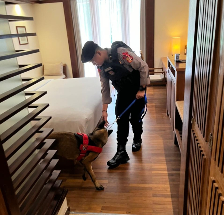 Sebelum memasuki kamar hotel lokasi delegasi menginap, Satgas Sterilisasi Ops Puri Agung dari personil Gegana Brimob dengan Unit K.9 Polri, mengecek setiap sudut-sudut kamar hotel dengan menggunakan metal detektor, miror dan anjing pelacak.