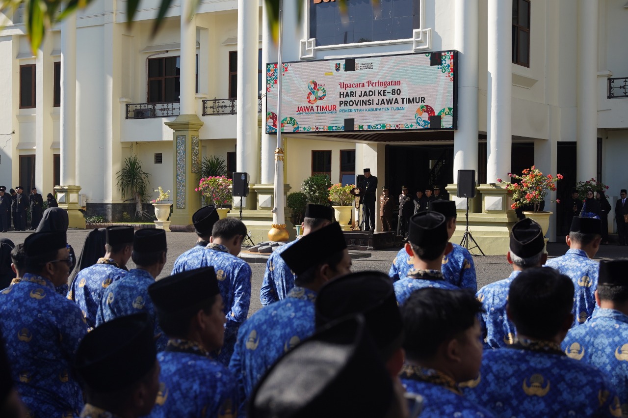Dalam sambutannya, Wabup Joko Sarwono menyampaikan bahwa peringatan Hari Jadi ke-80 Provinsi Jawa Timur menjadi momentum penting untuk memperkokoh sinergi antara Pemkab Tuban dengan Pemprov Jawa Timur. Ia menegaskan bahwa Pemkab Tuban senantiasa mendukung setiap program dan kebijakan pembangunan yang digagas oleh Pemerintah Provinsi Jawa Timur.