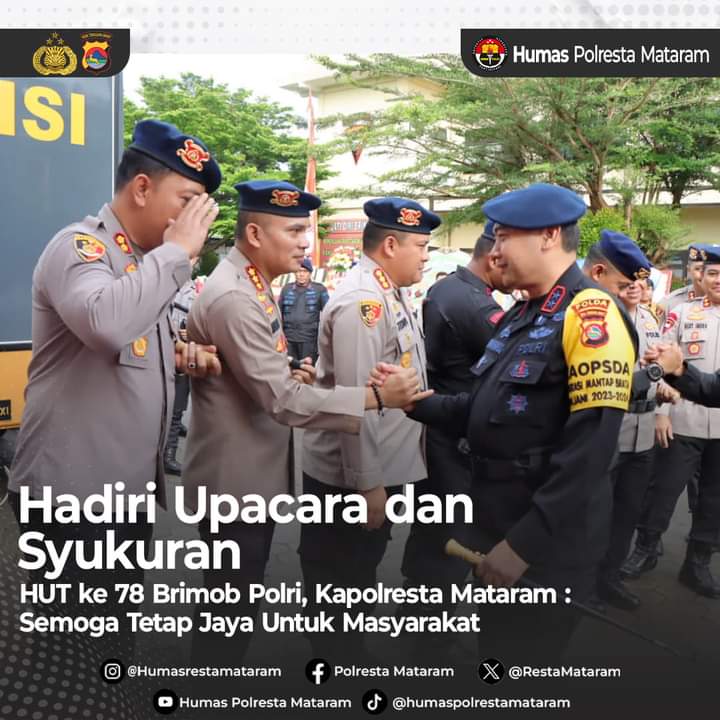 “Kehadiran kita merupakan bentuk dukungan sekaligus memberikan ucapan selamat kepada rekan-rekan di satuan Brimob dalam rangka Hari Ulang Tahun. Semoga kedepan kehadiran Brimob di NTB semakin dapat dirasakan masyarakat NTB terutama dalam menciptakan Keamanan di tengah masyarakat,”ucap Mustofa sapaan akrab Kapolresta Mataram.