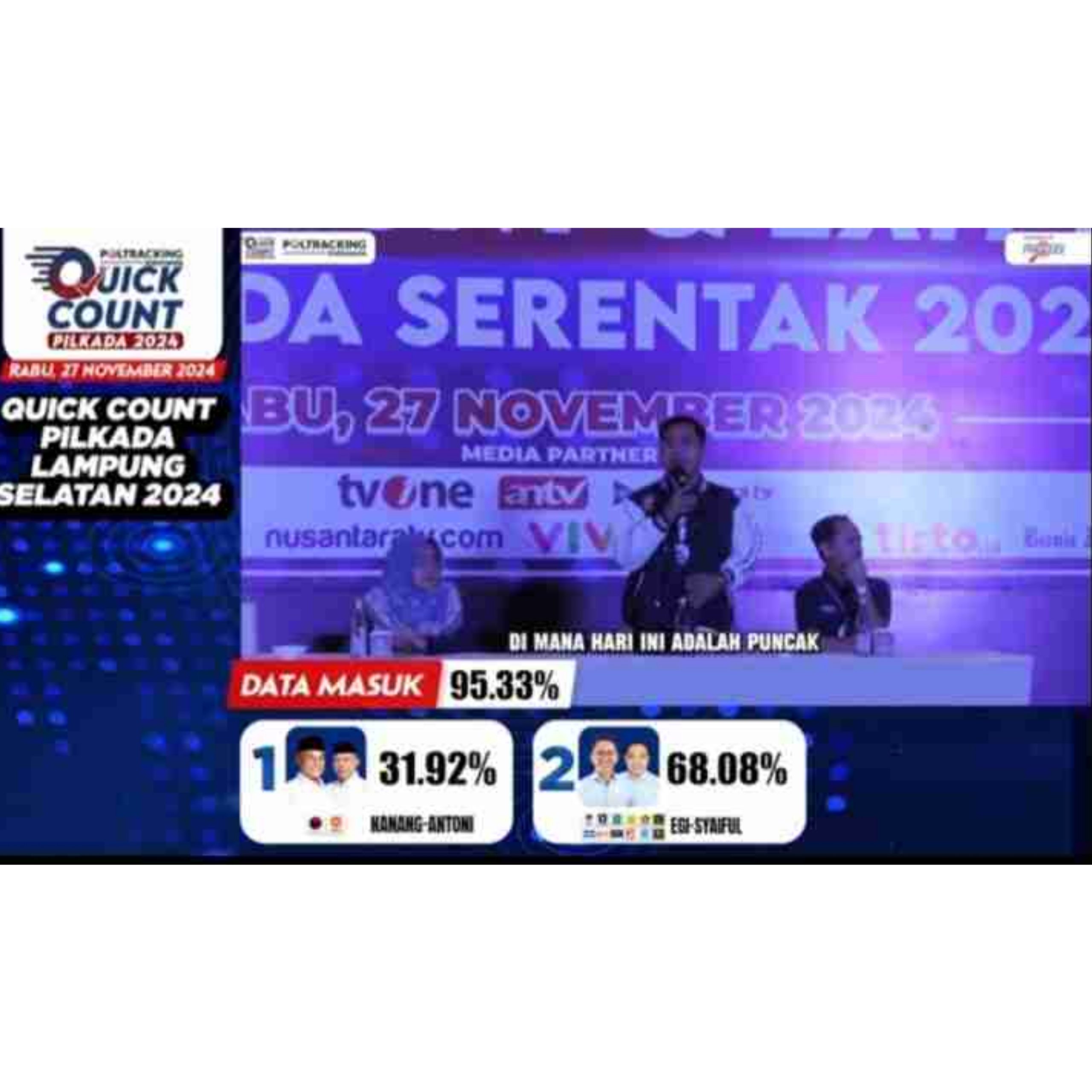 Lampung Selatan, Transpos.id. – Pesta Demokrasi dalam Pemilihan Kepala Daerah (Pilkada) Serentak Pasangan cabup dan cawabup Lampung Selatan (Lamsel) nomor urut 2 Radityo Egi Pratama-Syaiful Anwar unggul sementara dalam Pilkada Lampung Selatan berdasarkan hasil hitung cepat (quick count) Poltracking Indonesia. Dari 95.33% data yang masuk hingga pukul 17.30 WIB, pasangan Egi-Syaiful meraih 68,08% suara, jauh mengungguli pasangan Nanang-Antoni yang hanya memperoleh 31,92%.