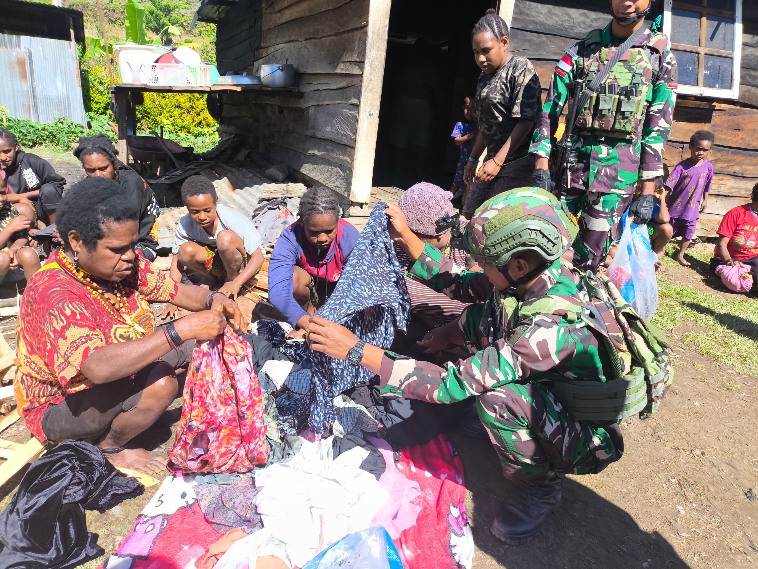 Puncak Jaya – Dengar keluhan warga pagaleme yang rumahnya di bakar akibat konflik Pilkada dan sampai sekarang belum dapat kembali akibat semua barang-barang habis terbakar, dan datang ke pos Satgas Yonif 715/Mtl untuk curhat dan mengatakan bahwa mereka sangat memerlukan bantuan pakaian keseharian karena habis terbakar, dengan sigap personel Pos Pruleme langsung mendatangi dan memberikan bantuan untuk mengatasi kesulitan masyarakat yang ada di Pagaleme, Distrik Mulia Puncak Jaya, Jumat (23/05/2025).