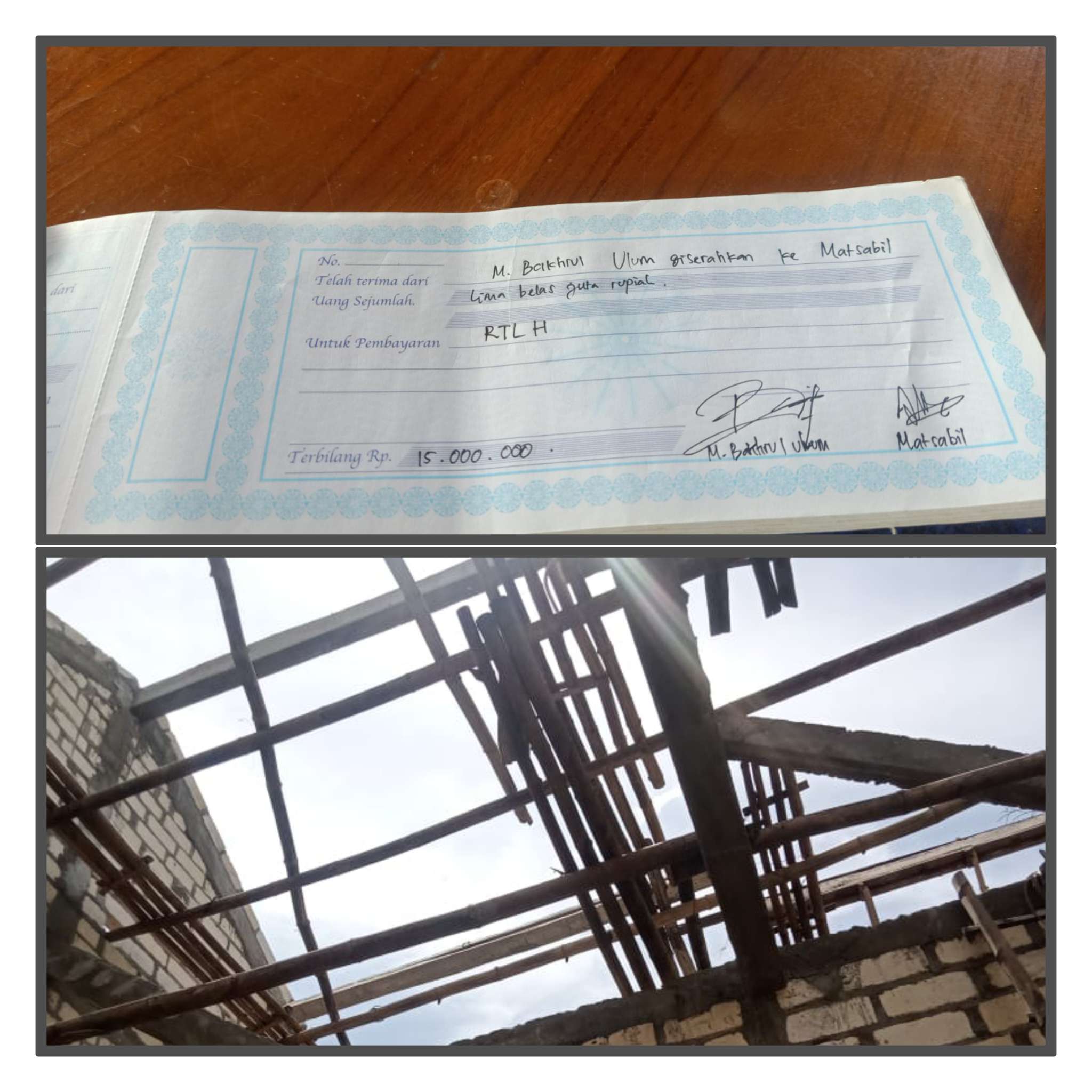 Buktinya Kepala Desa Mojoagung M Bakhrul Ulum seakan gusar ketika diminta awak media ini untuk menunjukan kwintasi yang diduga sudah dimanipulasi sendiri dengan tanda tangan Kepala Desa dan warga penerima program RTLH.