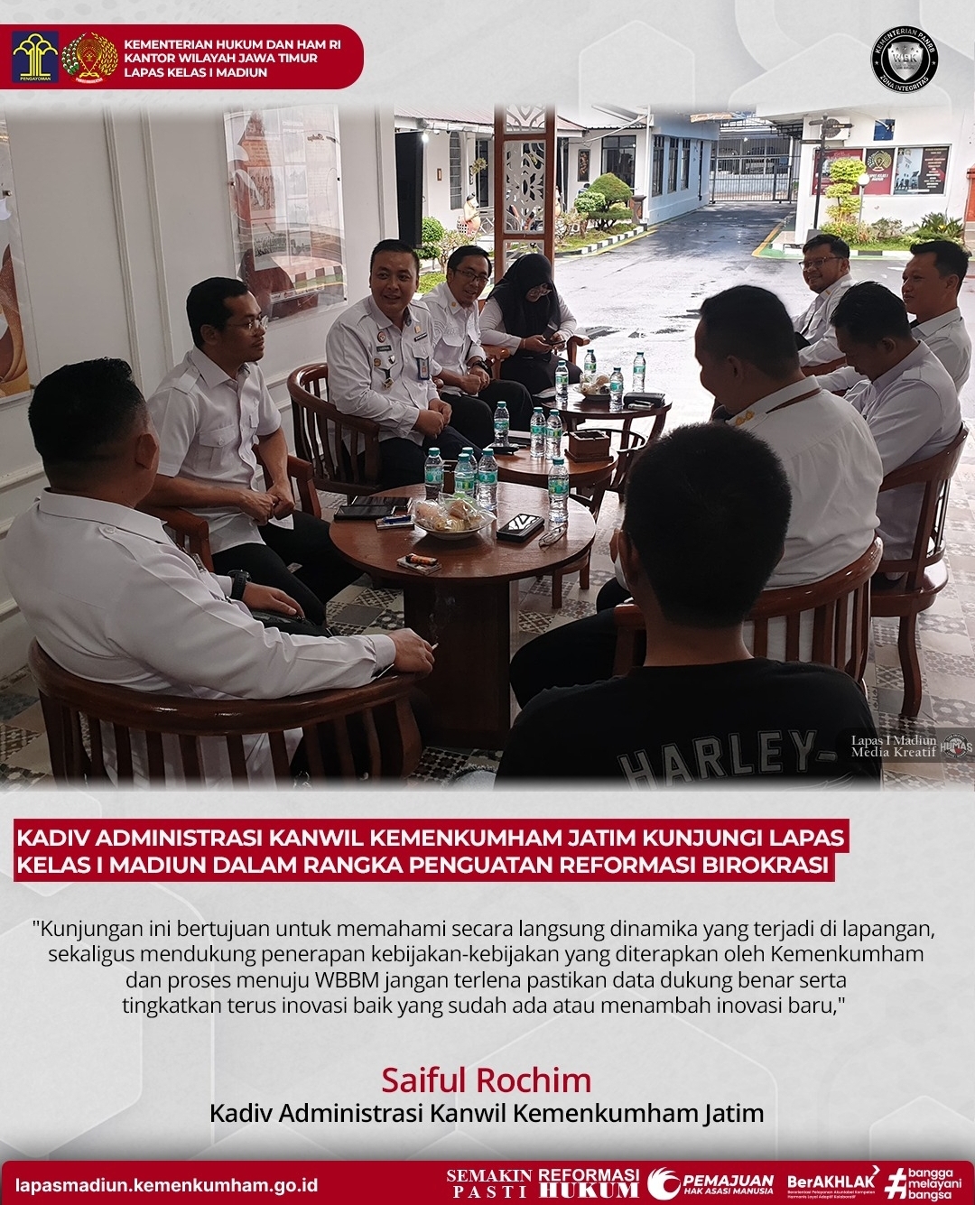 Madiun, Transpos.id- Dalam upaya penguatan reformasi birokrasi di lingkungan Kementerian Hukum dan HAM (Kemenkumham), Kadiv Administrasi Kanwil Kemenkumham Jawa Timur Bapak Saiful Rochim, melakukan kunjungan ke Lembaga Pemasyarakatan Kelas I Madiun. Kunjungan ini bertujuan untuk memantau langsung kondisi serta monitoring penerapan kebijakan di lapas, Rabu (28/02).