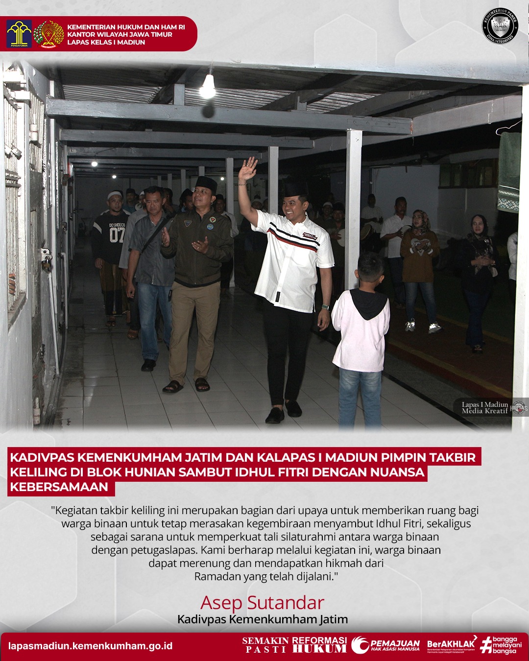 Kadivpas Kemenkumham Jatim Asep Sutandar dalam sambutannya mengatakan, “Kegiatan takbir keliling ini merupakan bagian dari upaya untuk memberikan ruang bagi warga binaan untuk tetap merasakan kegembiraan menyambut Idhul Fitri, sekaligus sebagai sarana untuk memperkuat tali silaturahmi antara warga binaan dengan petugas lapas. Kami berharap melalui kegiatan ini, warga binaan dapat merenung dan mendapatkan hikmah dari Ramadan yang telah dijalani.”