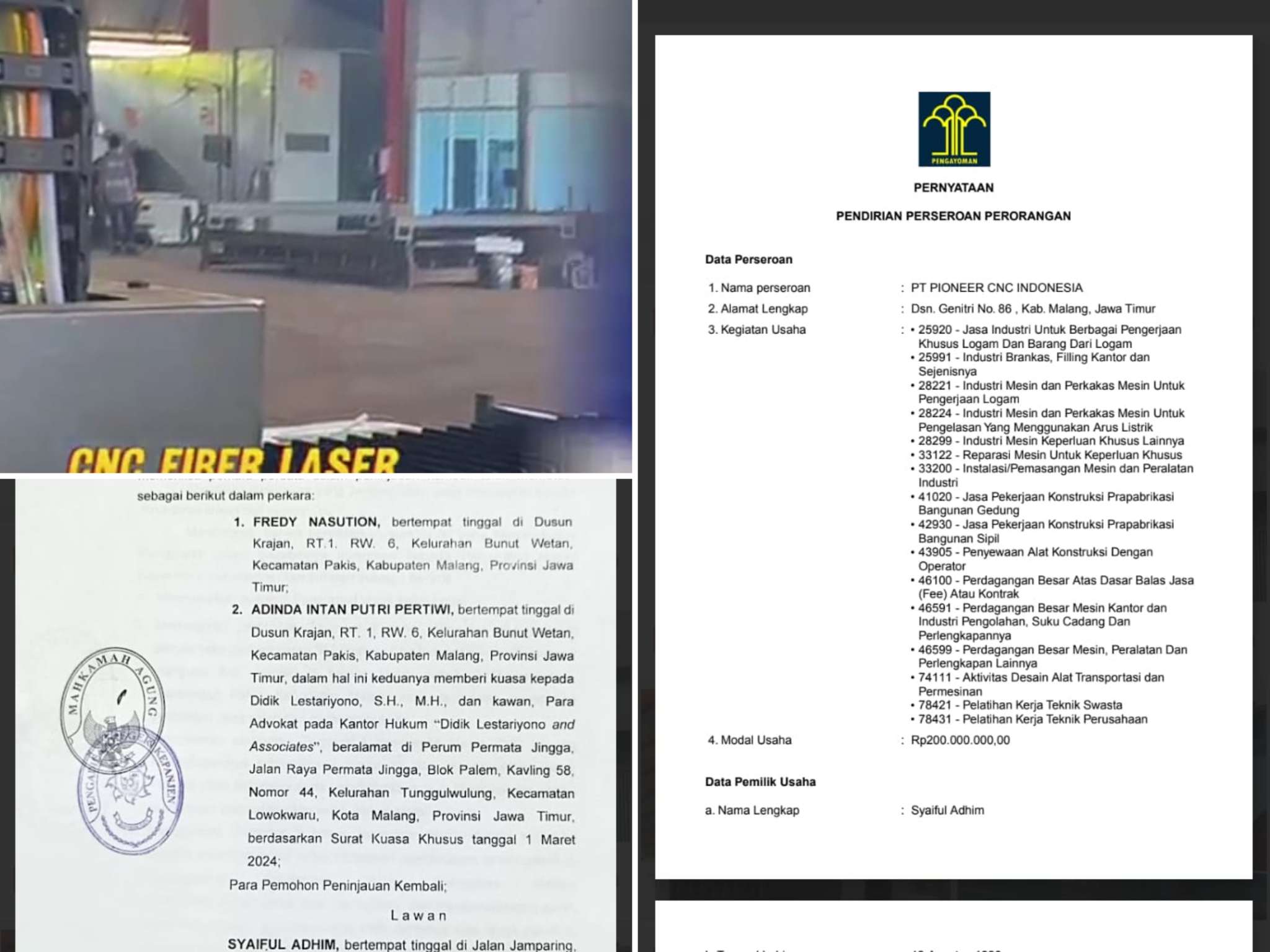 Putusan Pengadilan Negeri Kepanjen No. 65/Pdt.G/2023/PN.Kpn tanggal 12 September 2023, yang dikuatkan oleh Pengadilan Tinggi Surabaya No. 684/Pdt/2023/PT.Sby pada 31 Oktober 2023, menyatakan bahwa Fredy Nasution membawa barang milik Syaiful senilai Rp713.184.560. Putusan ini telah berkekuatan hukum tetap, dan secara sah menetapkan bahwa usaha serta seluruh kekayaan PT PIONEER CNC INDONESIA adalah milik tunggal Syaiful Adhim.