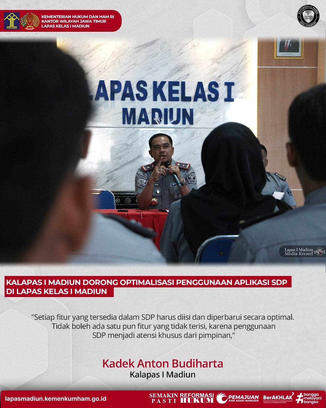 Kalapas I Madiun, Kadek Anton Budiharta menekankan pentingnya pengisian dan pembaruan optimal fitur-fitur yang ada dalam Aplikasi SDP. “Setiap fitur yang tersedia dalam SDP harus diisi dan diperbarui secara optimal. Tidak boleh ada satu pun fitur yang tidak terisi, karena penggunaan SDP menjadi atensi khusus dari pimpinan,” Ujarnya.