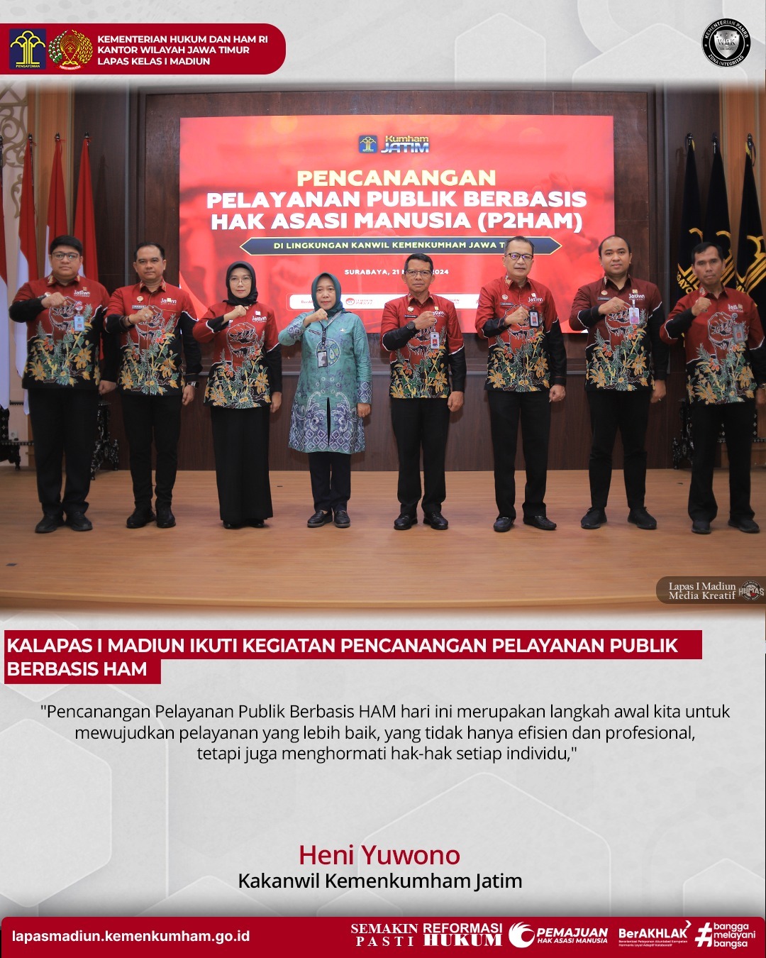 Acara Pencanangan Pelayanan Publik Berbasis HAM di Kanwil Kemenkumham Jatim yang dilaksanakan pada hari ini mendapat dukungan penuh dari berbagai pihak, termasuk Kepala Lembaga Pemasyarakatan Kelas I Madiun Kadek Anton Budiharta, yang turut serta dalam acara tersebut.