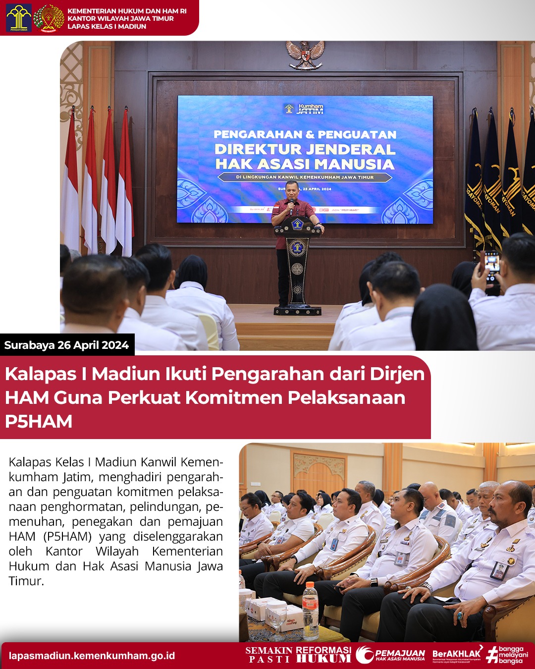 Surabaya, transpos.id- Kalapas Kelas I Madiun Kanwil Kemenkumham Jatim, menghadiri pengarahan dan penguatan komitmen pelaksanaan penghormatan, pelindungan, pemenuhan, penegakan dan pemajuan HAM (P5HAM) yang diselenggarakan oleh Kantor Wilayah Kementerian Hukum dan Hak Asasi Manusia Jawa Timur, Jumat(26/4). Kegiatan ini berlangsung di Aula kantor Kanwil Kemenkumham Jatim dihadiri oleh Direktur Jenderal Hak Asasi Manusia dan berbagai pejabat terkait di lingkungan Kemenkumham Jatim.