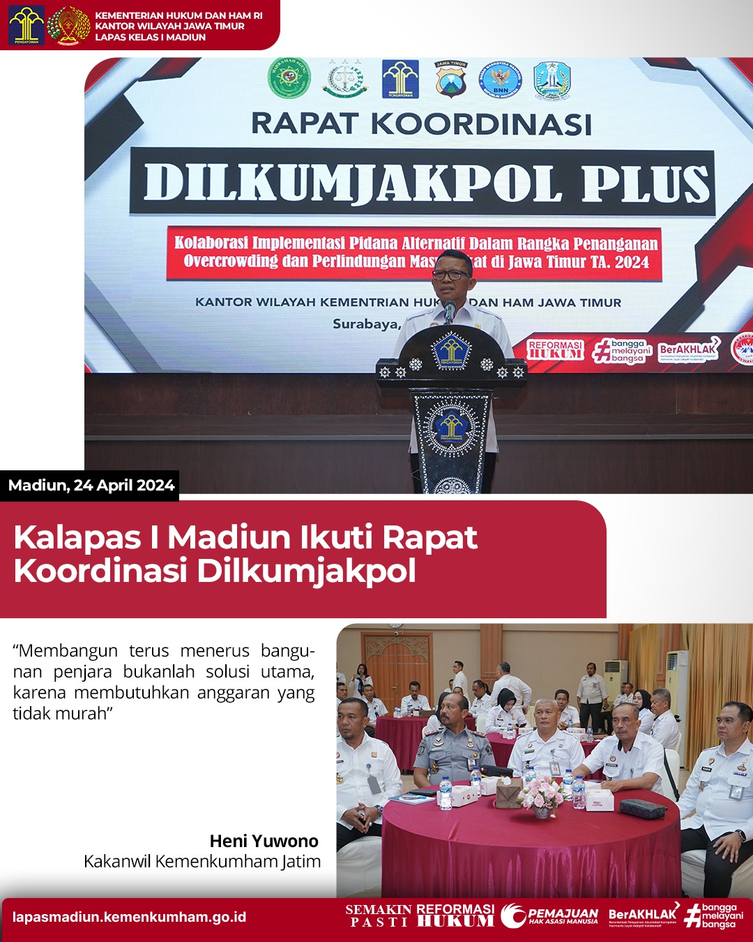 Kakanwil Kemenkumham Jatim Heni Yuwono mengajak peserta rakor dilkumjakpol beserta jajaran pemasyarakatan dapat berkomitmen memberikan dukungan penuh dan siap terus untuk lebih berkontribusi pada peran system peradilan dalam mengurangi overcrowding untuk kepentingan masyarakat. (Fz)