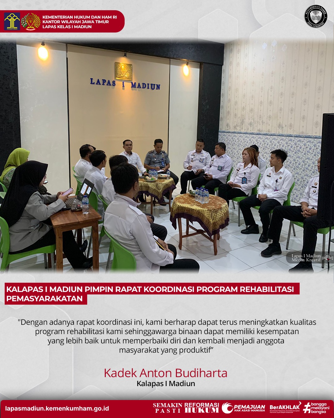 Madiun, transpos.id — Lapas Kelas I Madiun Kanwil Kemenkumham Jatim menyelenggarakan Rapat Koordinasi Program Rehabilitasi Pemasyarakatan dengan tujuan meningkatkan efektivitas dan persiapan program rehabilitasi bagi warga binaan. Rapat ini diadakan di ruang rapat Klinik Lapas, dipimpin oleh Kalapas Kadek Anton Budiharta serta Kabid Pembinaan Budi Ruswanto beserta Petugas Lapas yang menjadi Tim rehabilitasi.