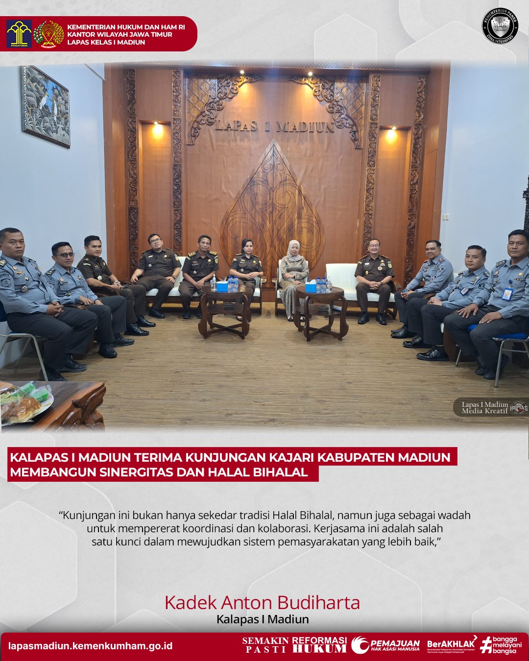 Kalapas I Madiun, Kadek Anton Budiharta mengatakan pentingnya kerjasama yang erat antara Lembaga Pemasyarakatan dan Kejaksaan Negeri “Kunjungan ini bukan hanya sekedar tradisi Halal Bihalal, namun juga sebagai wadah untuk mempererat koordinasi dan kolaborasi. Kerjasama ini adalah salah satu kunci dalam mewujudkan sistem pemasyarakatan yang lebih baik,” ujarnya.