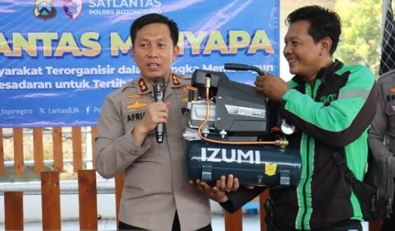 Dalam kesempatan tersebut, AKBP Afrian secara simbolis menyerahkan tiga unit kompresor, alat tambal ban, serta 50 paket sembako kepada perwakilan komunitas ojol.