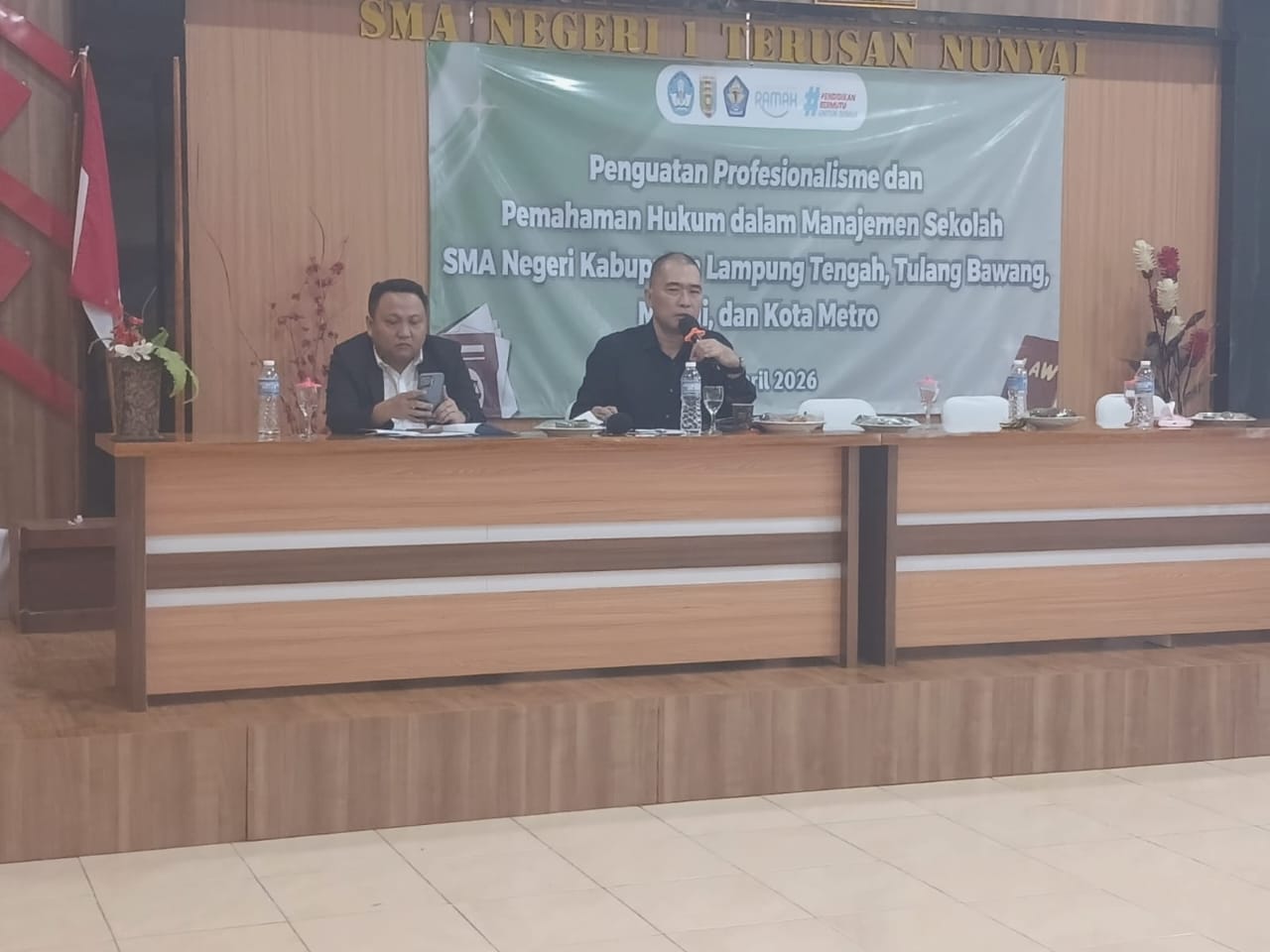 Sementara itu, Kepala SMA Negeri 1 Terusan Nunyai Lampung Tengah, Dra. Ratnawati, M.Pd., dalam keterangannya menyampaikan apresiasi atas terselenggaranya kegiatan tersebut. Ia menilai materi yang disampaikan sangat membantu pihak sekolah dalam memahami aspek hukum yang selama ini kerap menjadi kendala dalam pengelolaan administrasi dan kebijakan sekolah.