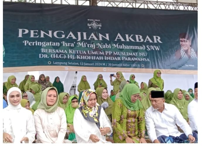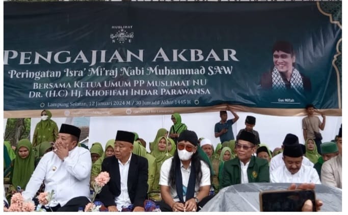 Helatan pengajian Akbar tersebut juga dihadiri langsung oleh Ketua Umum PP Muslimat NU Dr. (H.C) Hj. Khofifah Indar Parawansa, M.Si, Ketua Umum PAN Zulkifli Hasan, Putri Zulkifli Hasan, Gubernur Lampung Arinal Djunaidi, Rycko Menoza SZP dan para tokoh ulama NU di Provinsi Lampung.