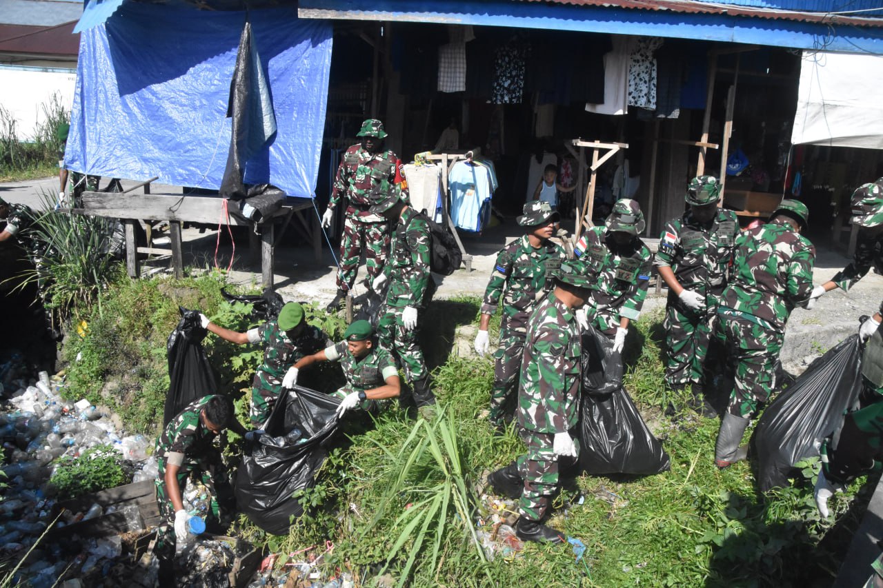 Aksi tersebut melibatkan personel gabungan TNI di wilayah Timika, Dinas Perindustrian dan Perdagangan Kab. Mimika, serta didukung oleh pelajar dan masyarakat sekitar. Kegiatan ini merupakan bagian dari gerakan ‘perang terhadap sampah’ sebagai wujud kepedulian bersama dalam menjaga kebersihan lingkungan.
