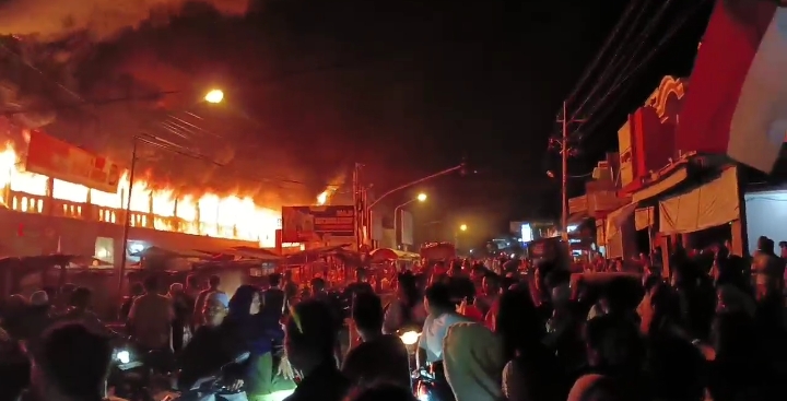 Peristiwa tersebut terjadi sekitar pukul 02.00 WIB itu membuat ratusan kios yang berderet di sepanjang jalan dan lantai 2 ludes terbakar.