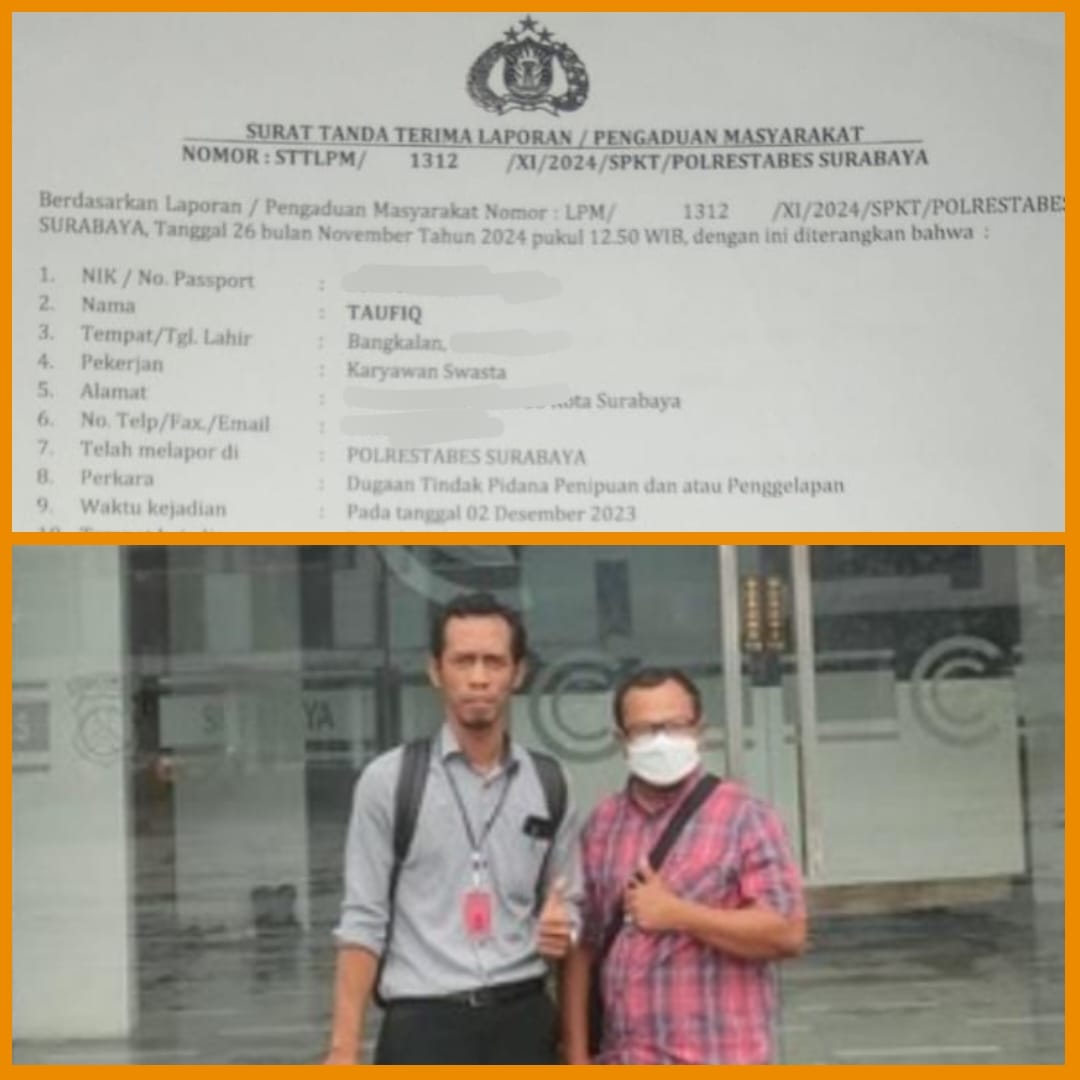 Surabaya – Berdasarkan surat tanda terima laporan/ pengaduan, Nomer: STTLPM/1312/XI/2024/SPKT/Polrestabes Surabaya, tanggal 26 bulan November, tahun 2024, pukul 12.50 wib.Taufiq secara resmi melaporkan terkait dugaan kasus tindak pidana Penggelapan dan Penipuan sebagaimana dimaksud dalam pasal 372 KUHP dan Pasal 378 KUHP oleh kedua oknum pengacara inisial AM dan MT.