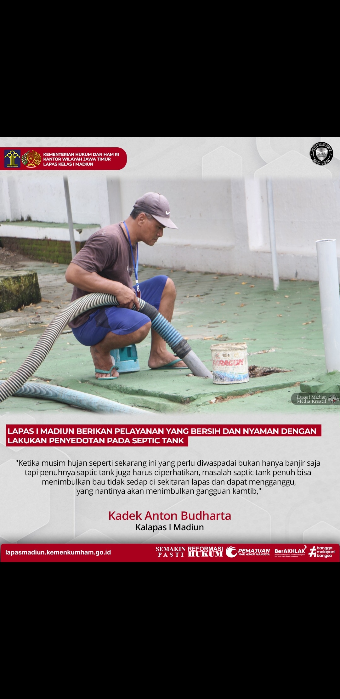 Kalapas I Madiun, Kadek Anton budiharta mengatakan bahwa Peyedotan saptic tank bertujuan untuk menghindari pencemaran lingkungan dan tersendatnya saptic tank. Tak perlu menunggu WC mampet, sedot septic tank dilakukan secara rutin. Upaya ini agar lingkungan dan kualitas air di Lapas Kelas I Madiun tidak tercemar.
