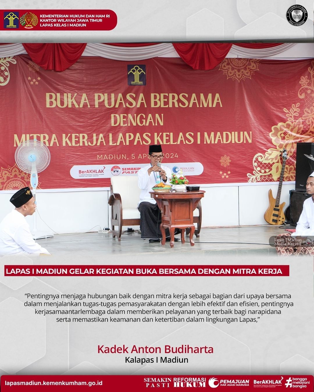 Madiun, Transpos.id- Lembaga Pemasyarakatan Kelas I Madiun Kanwil Kemenkumham Jatim menggelar acara buka bersama dengan mitra kerja sebagai bagian dari upaya mempererat hubungan dan memperkuat kolaborasi antara lembaga pemasyarakatan dengan berbagai pihak terkait. Acara yang diadakan di Lapas tersebut berlangsung dalam suasana penuh kehangatan dan kebersamaan, Jumat (05/04).