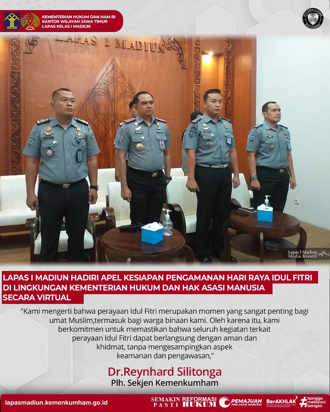 Madiun, Transpos.id – Dalam rangka menyambut Hari Raya Idul Fitri 1445 H / 2024 M, Lapas Kelas I Madiun Kanwil Kemenlumham Jatim mengikuti Apel Kesiapan Pengamanan Hari Raya Idul Fitri secara virtual, yang dilaksanakan oleh Kementerian Hukum dan Hak Asasi Manusia Republik Indonesia, Senin (01/04).